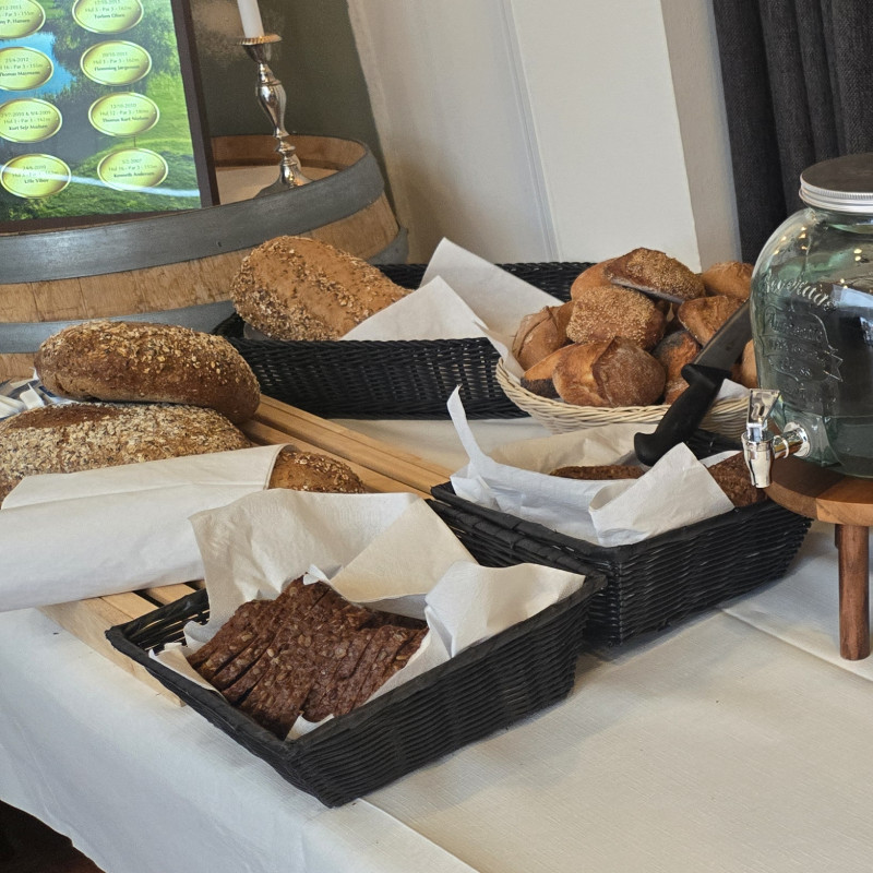 Brunchene serveres med friskbagt rundstykker og rugbrød. Kaffe/the og 2 slags juice er inkluderet i prisen.